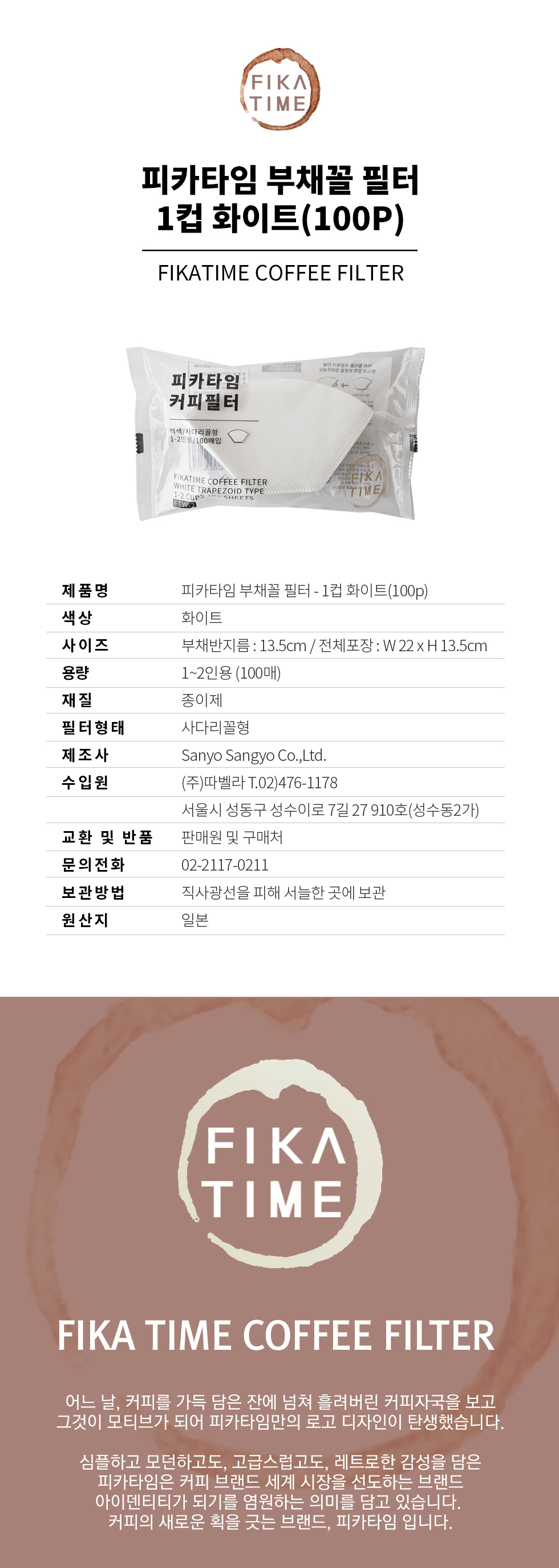 피카타임 1-2인용 칼리타형 종이 커피 필터 화이트 100매 사다리꼴 FIKATIME